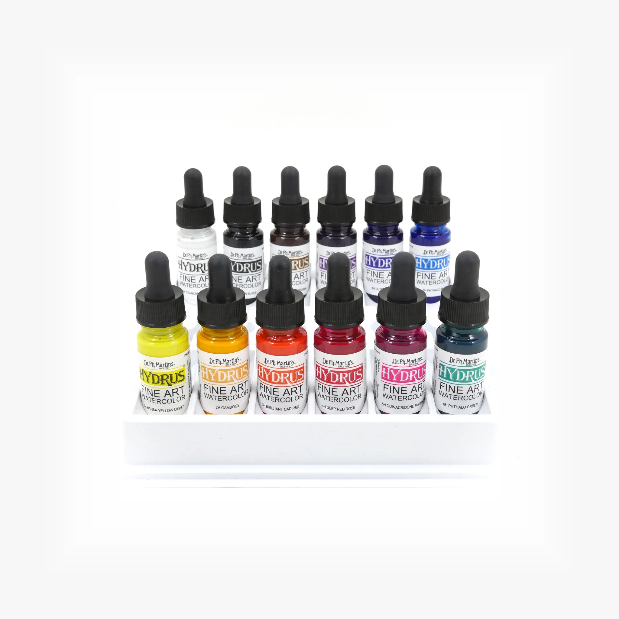 Dr. Ph. Martin's Hydrus Fine Art Watercolor is lightfast, transparent, fine art quality watercolor in a plastic bottle. This liquid product delivers the same brilliance and permanency as traditional tube watercolors. Made from the finest artist pigments, Dr. Ph. Martin's Hydrus Fine Art Watercolor can be blended and intermixed while still maintaining the transparency and luminosity of the colors. Great for use in technical, calligraphy, fountain pens, and in airbrushes. Each set includes 12 different colors in 0.5 oz (15 ml) plastic bottles with droppers.