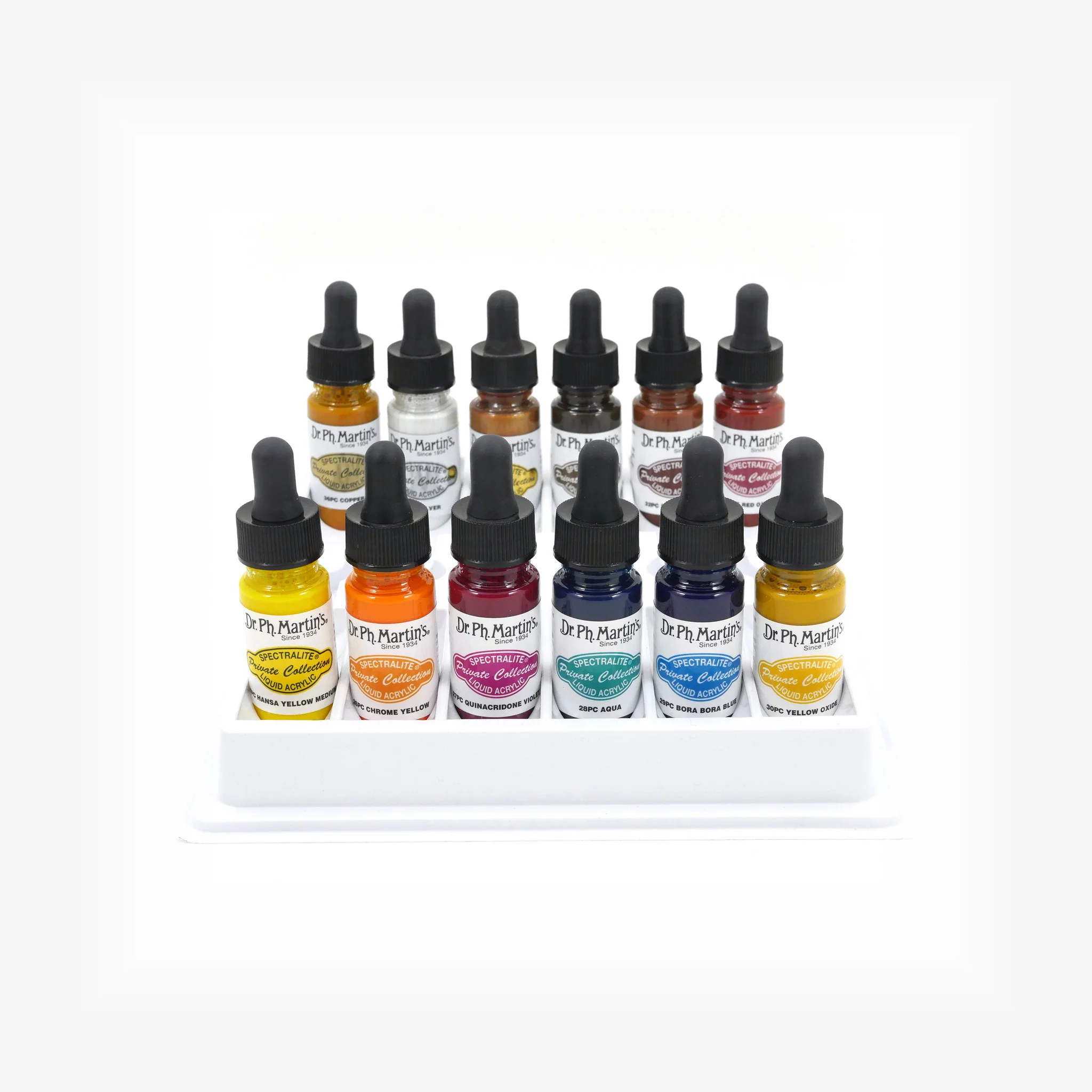 Dr. Ph. Martin's Spectralite Private Collection Liquid Acrylics are the brilliant, lightfast, waterproof acrylics that flow like watercolor. Our permanent, archival grade fine art color is made with the finest ground pigments sourced from around the world. Excellent on paper or canvas, Spectralite can also be used on board, wood or metal. Works for illustration, calligraphy pens, airbrushing, designing and technical pens. Dr. Ph. Martin's Spectralite Private Collection Liquid Acrylics are now available in three different sets with a total of 36 unique colors to choose from. Each set includes 12 different colors in 0.5 oz (15 ml) bottles with droppers. With its unique properties and a dynamic range of color unlike anything else on the market, Spectralite delivers unparalleled vibrance, detail, and control with every mark.